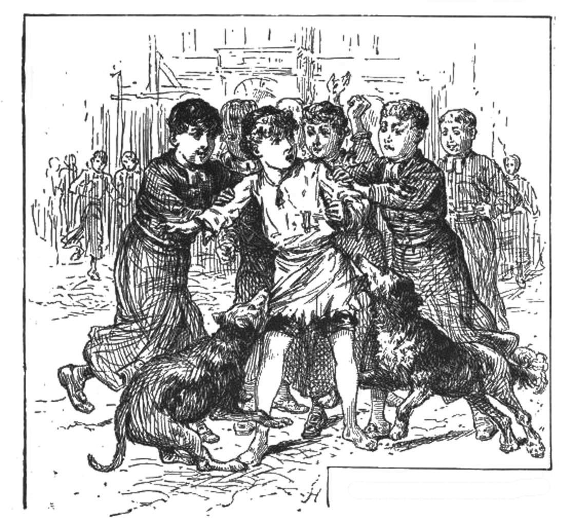 孤儿们原本只不过就想戏弄他一番,但听到他如此大声怒骂,便真的生气起来。那个顽皮的首领大声说道:“喂,他也太嚣张了,大家过来狠狠地揍他一顿!”