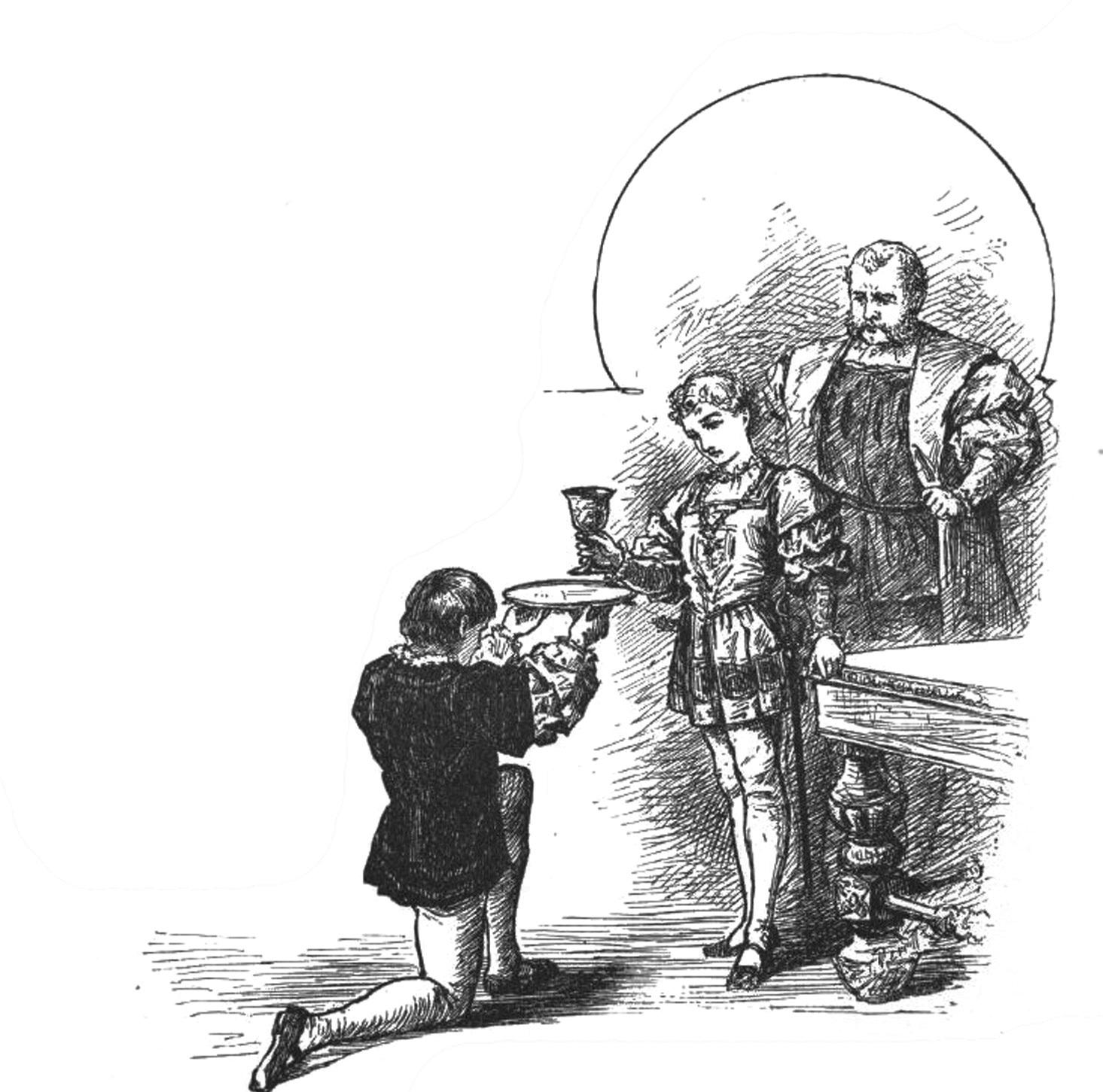 马上就有一个仆人端上放着一杯水的金盘,跪在汤姆的脚边。