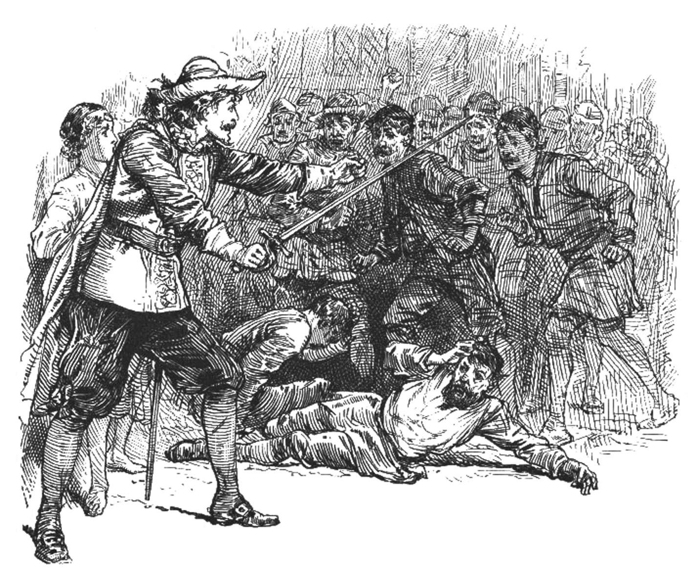 最先跑过来的那个人一下子就被打倒了,而他当时仅用了剑背。接着,他又风驰电掣般向四面八方舞动着长剑。一会儿的工夫,就又打倒了七八个人。一连串的动作干脆利落。