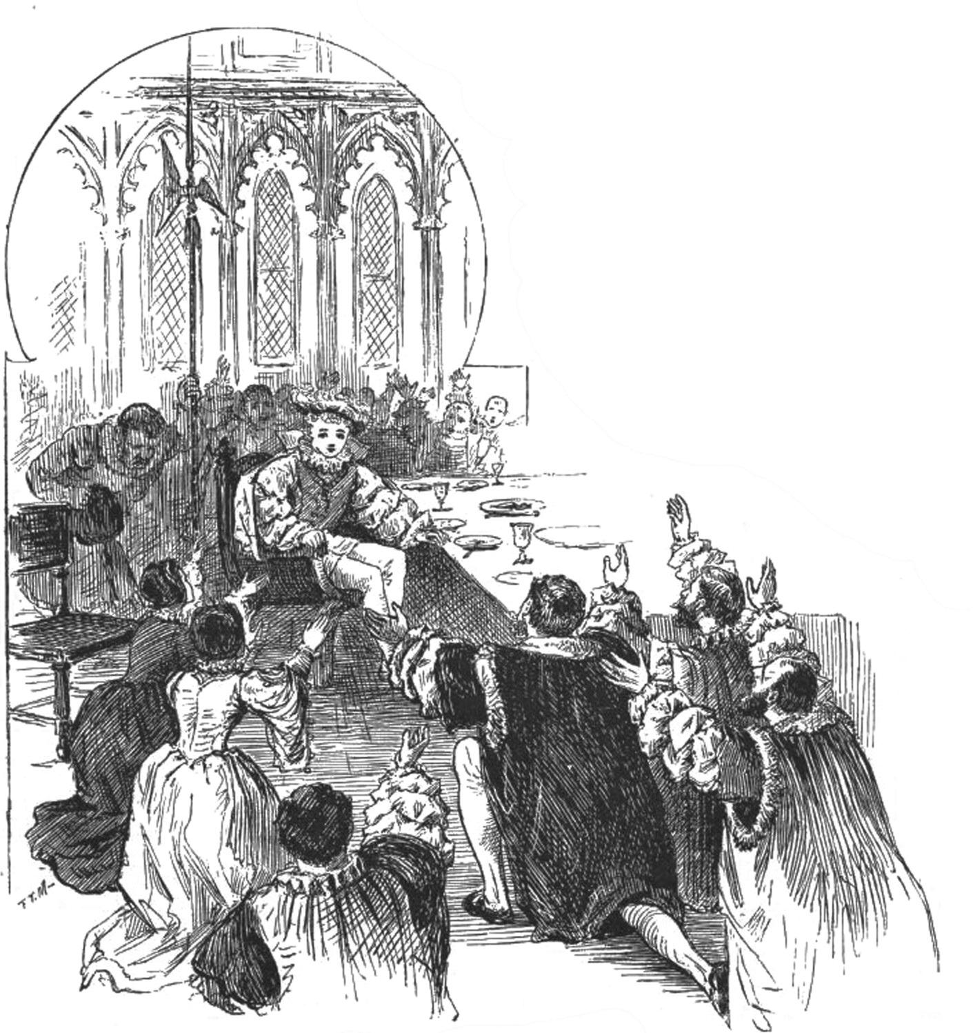 汤姆身穿镶满宝石的华美礼服,坐在正中高大气派的宝座上。伊丽莎白公主和珍·葛莉郡主,美丽端庄地分坐在汤姆的两边。宫中侍从、贵族和贵夫人们,整齐地排成一行,坐在后边的椅子上。他们只要稍稍一动,身上金光闪闪的勋章和宝石,在灯光的照射下,便如星星般闪闪发光。