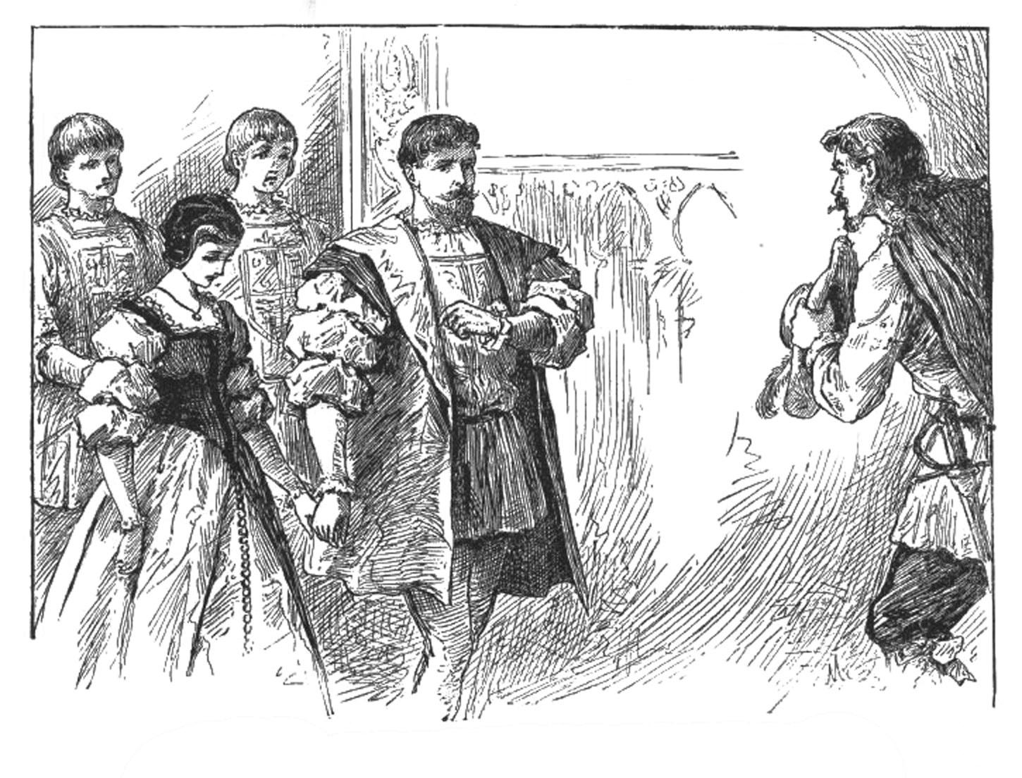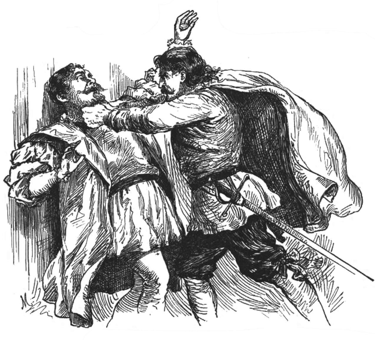 亨顿举着剑,瞪着修大骂道。修吓得手忙脚乱地向后退,慌乱中被椅子绊倒了,他恐慌地命令仆人们说:“喂,快点将这个家伙给我捆起来!”