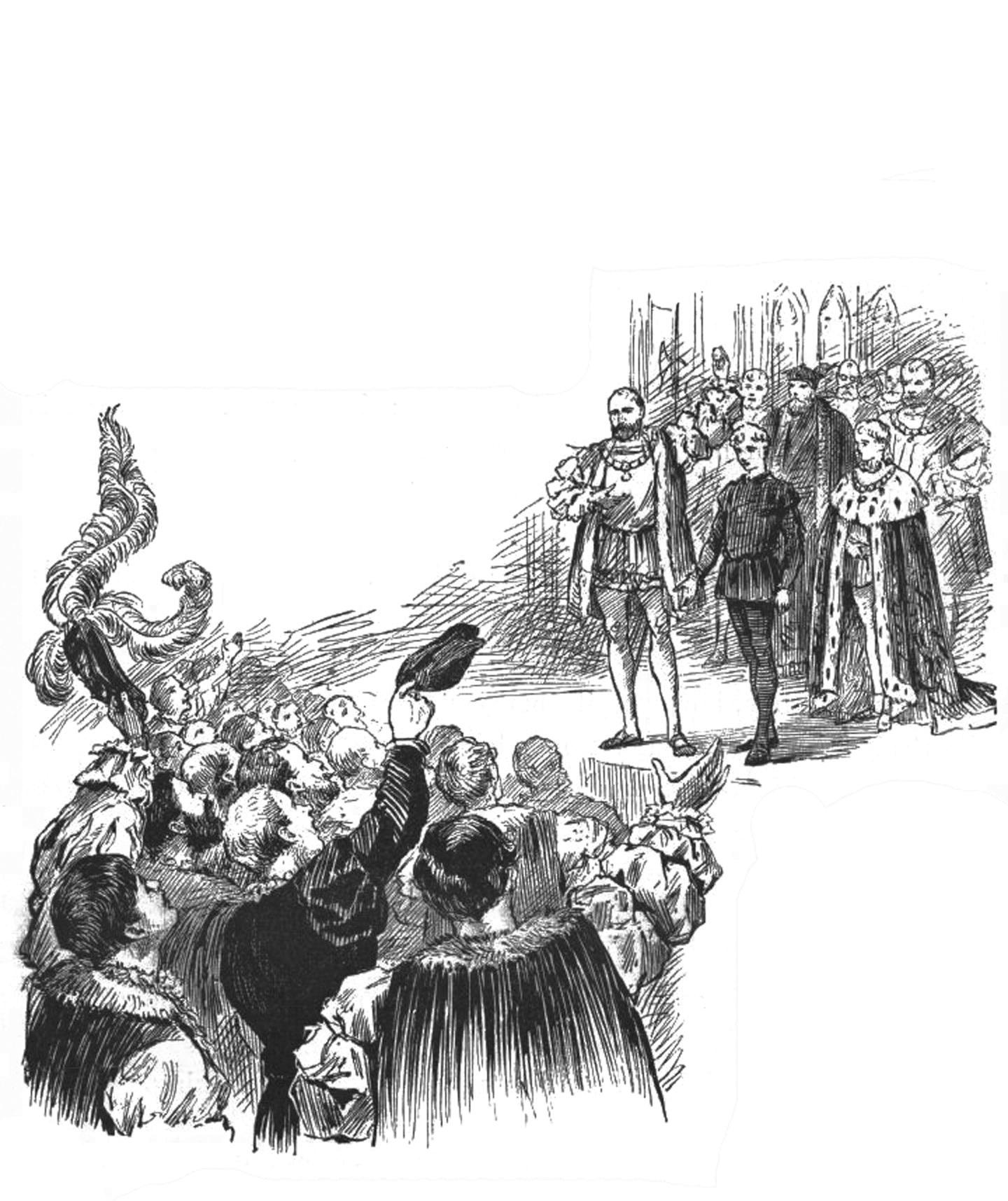 这时,爱德华没有丝毫畏惧地走上了礼坛。与他长得极其相像的汤姆,高兴地从礼坛上跳了下来,毕恭毕敬地跪奏道:“国王陛下,欢迎您归来。我无时无刻不在盼望着您早日归来!陛下,臣不胜惶恐,恳请您准许我为您戴上王冠吧。”